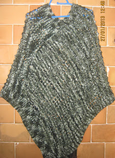 Tak wygląda część mojego poncho - ażurowy wzorek marki "kolczuga" z włóczki akrylowej czarno-szaro-zielony melanż. Wygląda super ale dopiero jak robiłam to zdjęcie to zorientowałam się, że ażur mi ucieka!!!! 35 cm roboty do wycofania! Druga przeszkoda to brak włóczki - już kupiona ale jeszcze nie dotarła. W międzyczasie,żeby mi druty nie stygły tym samym wzorkiem ale za to z mocherowej włóczki splecionej z dwóch kolorków powstaje...
