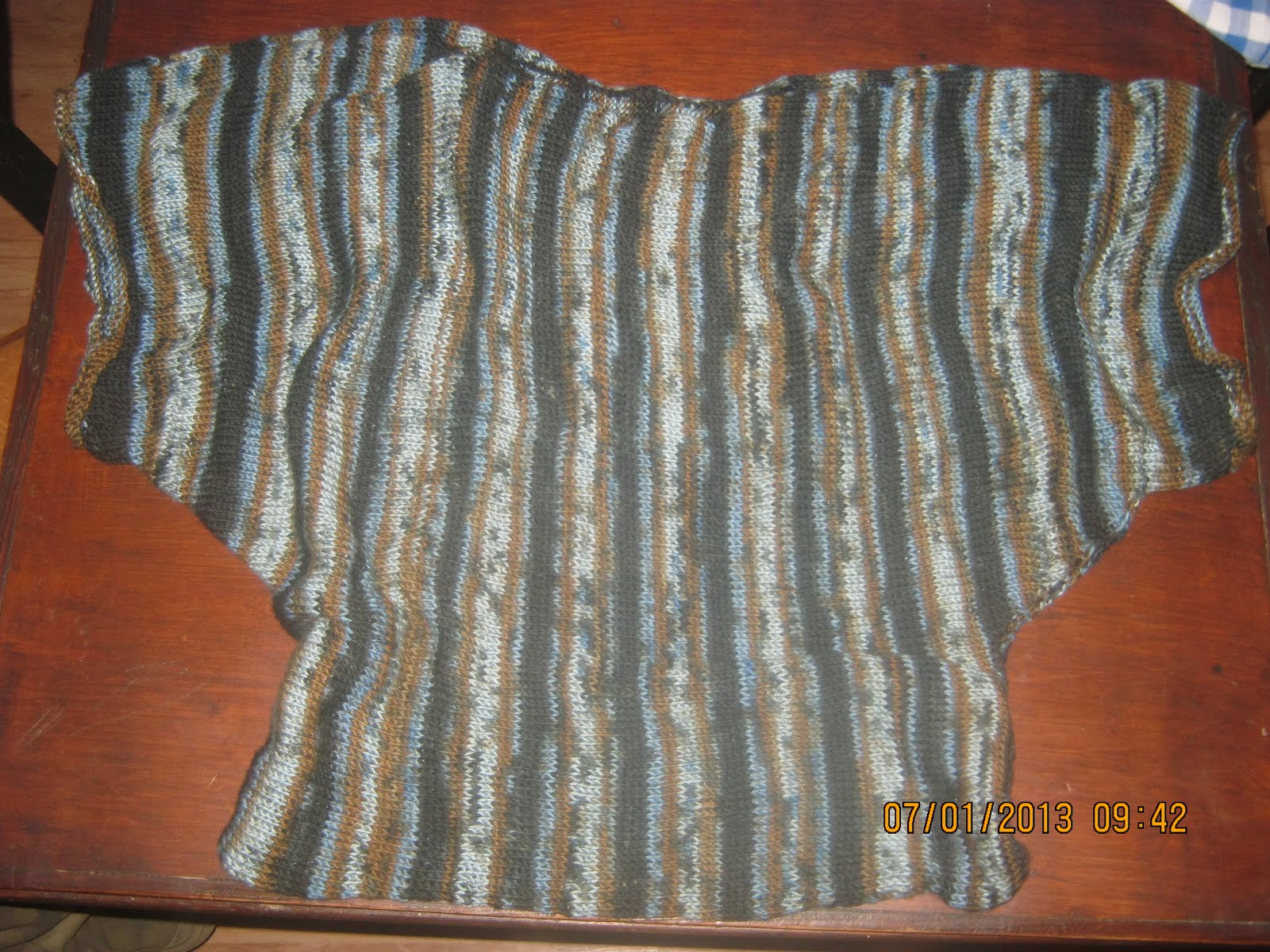 Zrobiłam ją w poprzek, żeby uzyskać pionowe paski - taka to jest sprytna włóczka - układa się w paski, ma jednak swoją wadę - nie widać na niej wzorków. Dlatego też zdecydowałam się zrobić ją zwykłym ściegiem. Brzegi obrobiłam szydełkiem może się nie rozciągną. Ten nodel świetnie wyszczupla - zdjęcia później po sesji zdjęciowej z poncho, którego jeden prostokąt już gotowy.
