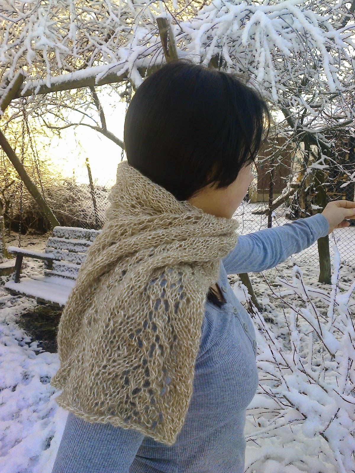 Szal mimo ażurowego wzoru jest ciepły chyba bo modelka nie zamarzła. Ponieważ jeszcze nie mam dosyć szaleństwa na temat tego wzoru mam jeszcze jeden pomysł ale...to tajemnica....