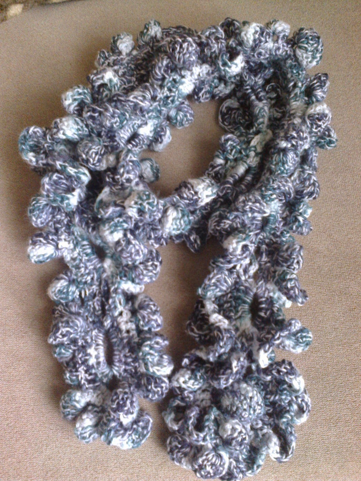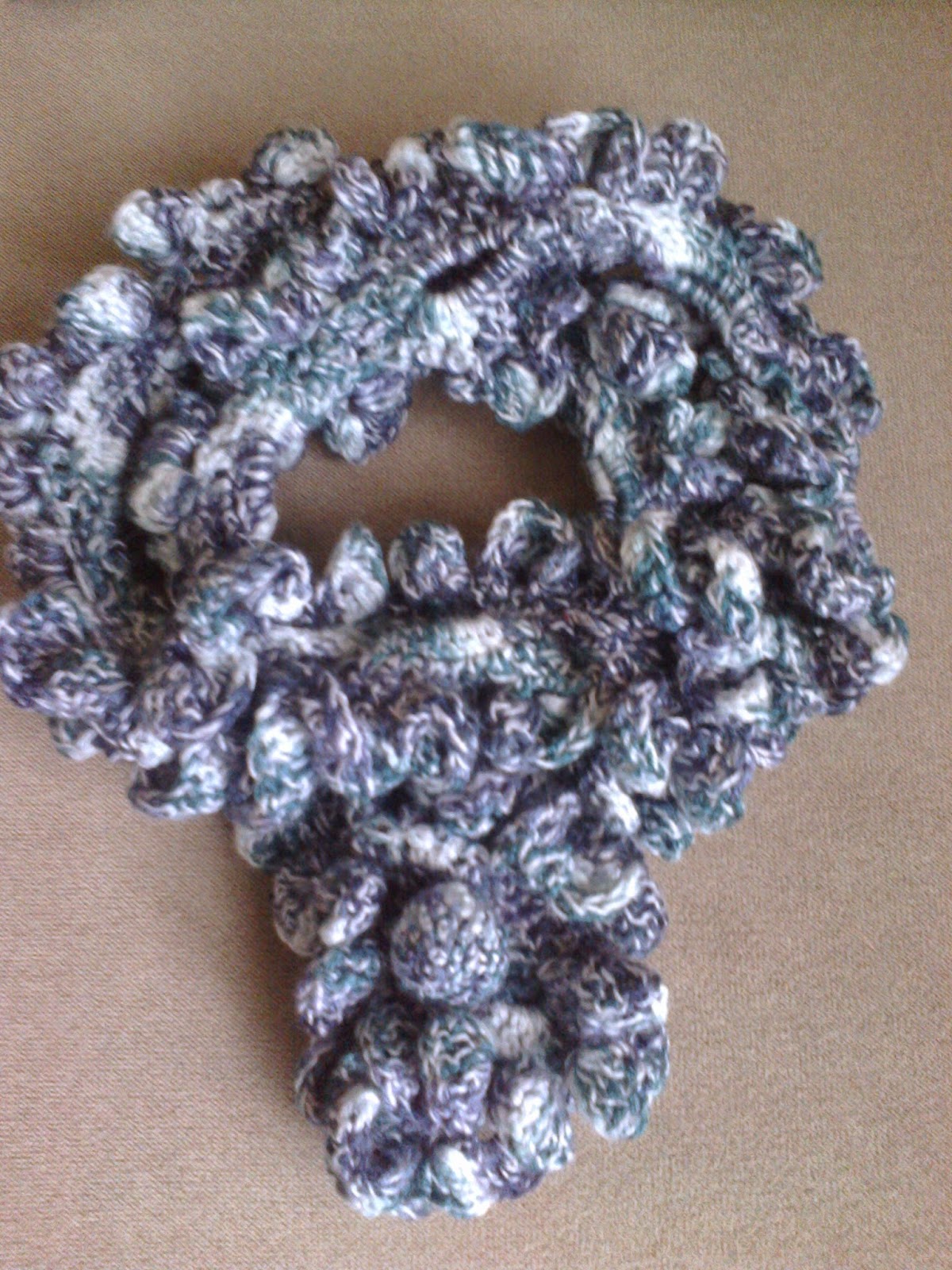 Szal zrobiłam wg schematu bardzo popularnego w internecie,ale z dość grubej włóczki co dało moim zdaniem bardzo ciekawy efekt i dodałam do niego zapięcie w postaci szydełkowej kulki widocznej na ostatnim zdjęciu.